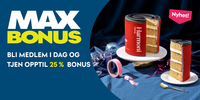 Som medlem av MaxBonus får du attraktive medlemstilbud, samt bonus på varer til veiledende priser, med enkelte unntak (se medlemsvilkår). I tillegg har du tilgang til Min Side som alltid gir deg oversikt over tidligere kjøp og kvitteringer, samt hvor mye bonus du har oppspart.